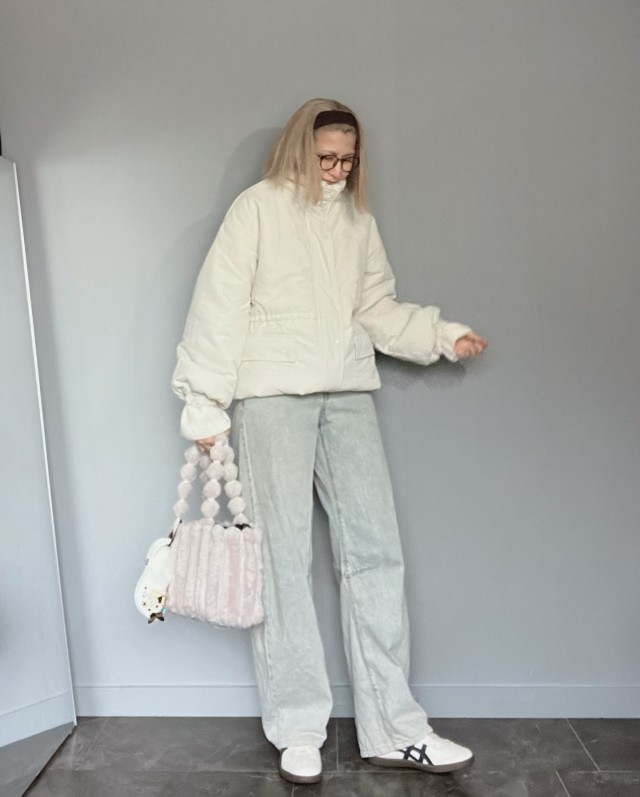 次にご紹介するのは、コーデュロイ素材のダウンジャケットとワイドデニムパンツを合わせたコーデ。一般的なナイロンのダウンではなくちょっと異なる素材感をセレクトすると、定番のカジュアルコーデにひねりを効かせることができます。ちなみに、しっとり見えるコーデュロイは大人っぽく使えておすすめですよ。