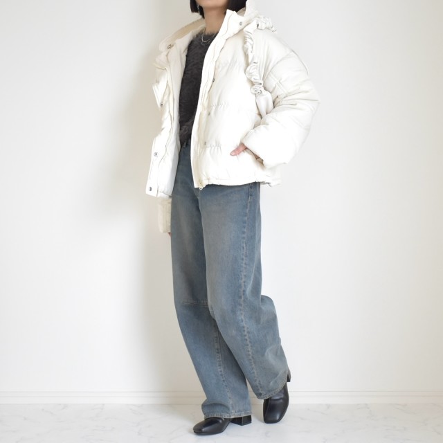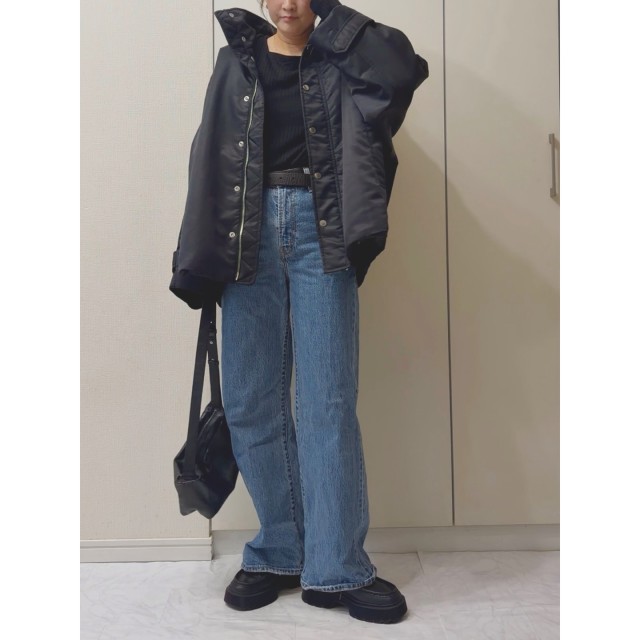 最後にご紹介するのは、ロングダウンとワイドデニムパンツの組み合わせ。「ロングダウンは着膨れ感が増しそう……」と思われがちですが、Iラインを意識すればスタイルアップが叶うんです。例えばスナップのようにフロントを開けて縦のラインを強調すると、ダウンもワイドデニムパンツもすっきり見えますよね♪