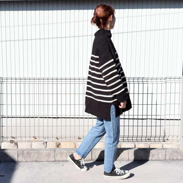 スナップで着用しているボーダーニットは>>reca(レカ)「ハイネックパネルボーダーニットプルオーバー」