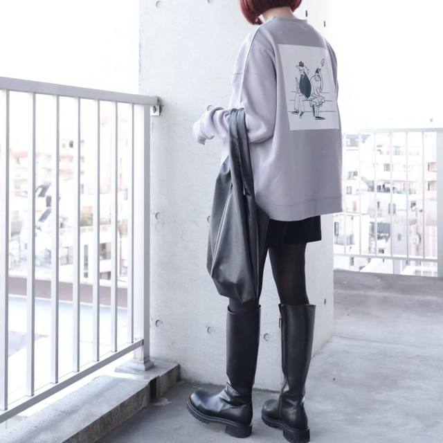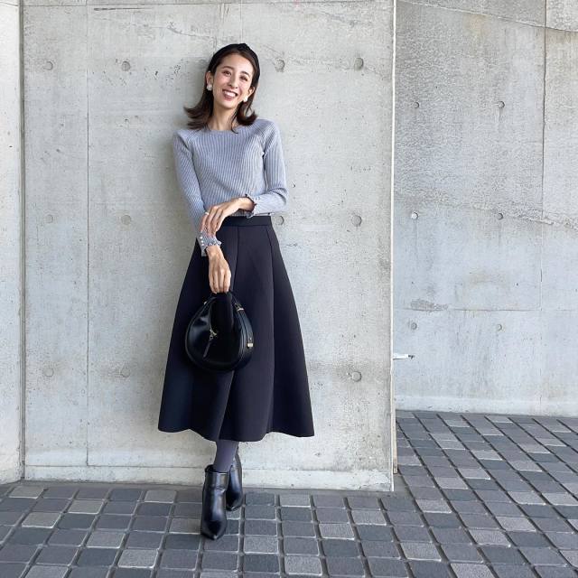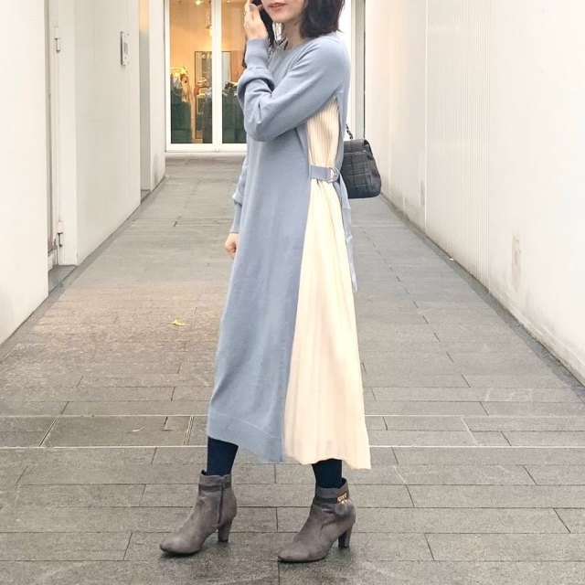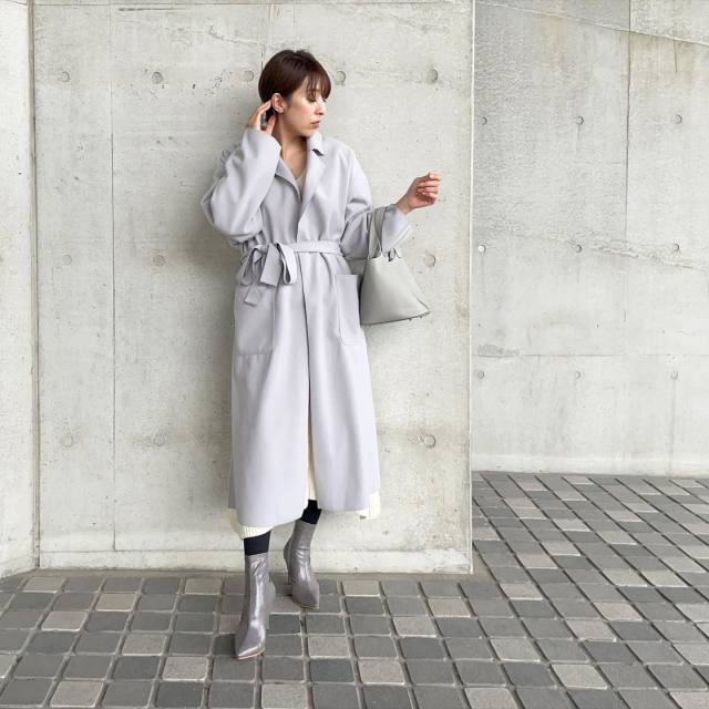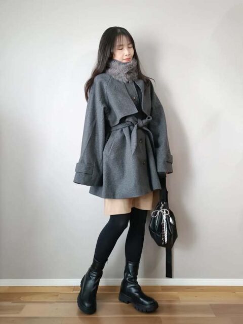 スモーキーな「グレーブーツ」には「黒タイツ」が最適。ブーツと同色のグレーのタイツを合わせたくなりますが、足元が浮いてしまい野暮ったく見える原因に。グレー×黒のモノトーンでまとめることでモードな印象となり、今どきのルックスに決まります。