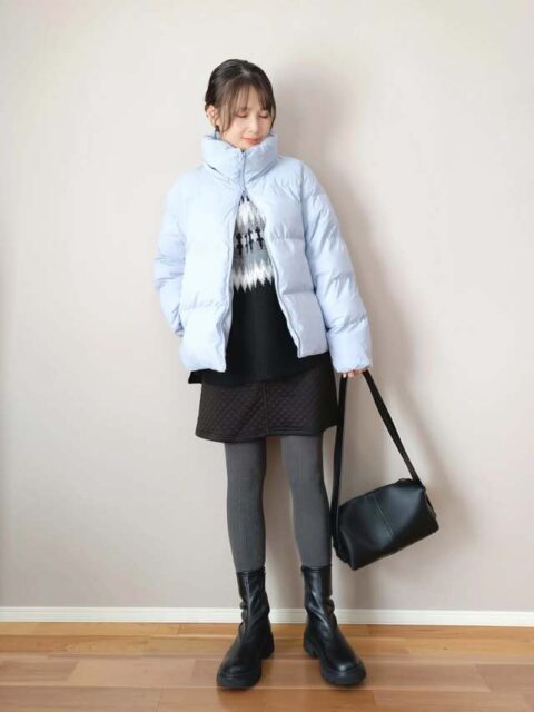 黒タイツ以外で黒ブーツに合わせるなら「グレータイツ」がおすすめ。無彩色で濃淡がつくので、ブーツとタイツの色は違ってもコーデの違和感はありません。