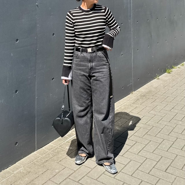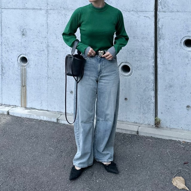 袖口のスリットから配色切り替えが覗く「レイヤードリブニット」。ぴったりとしたシルエットとリブ編みの合わせ技で着瘦せ見え効果が抜群です。ボリュームパンツにウエストインして着こなすとコーデバランスが整いますよ。