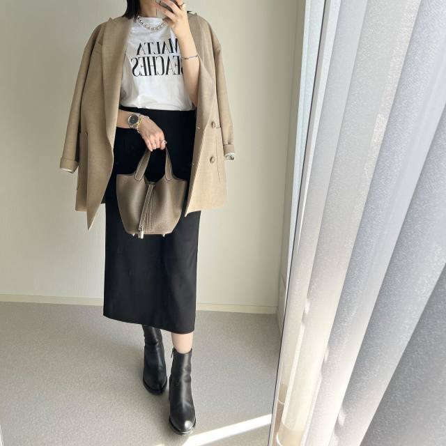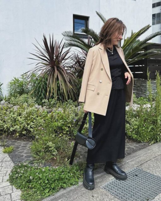 上品な雰囲気に決まるのがベージュジャケット。ともすれば堅苦しく見えがちなジャケットに柔らかさが加わり、コーデがこなれ見え。黒スカートを女性らしく着こなせますよ。