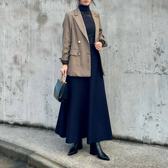 深みのあるブラウンのジャケットはクラシカルなムードたっぷり。黒スカートに合わせれば落ち着きのあるハンサムなルックスに。スカートコーデの甘さを抑えて大人っぽい装いに仕上がります。