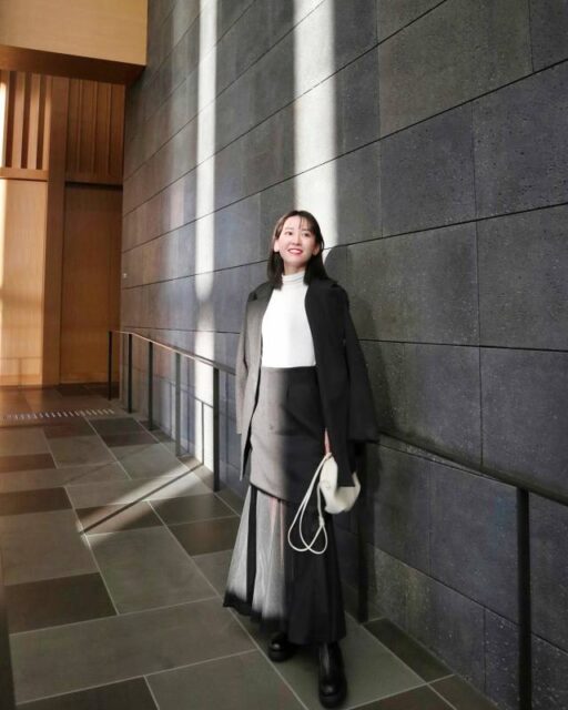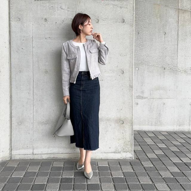 黒スカートはグレージャケットと相性バツグン。無彩色同士の組み合わせなのでコーデの統一感がグンとアップ。さらに黒×グレーの濃淡がつくため、立体感のあるモノトーンカラーコーデに決まりますよ。