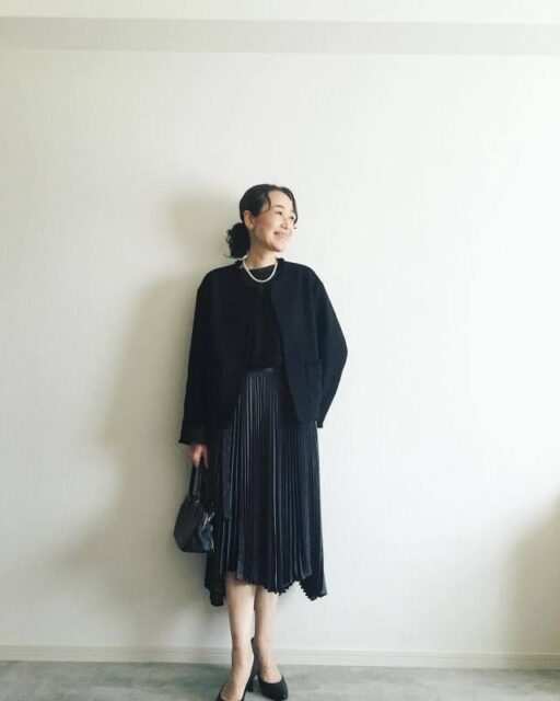 べーシックな黒スカートは使い勝手バツグン。しかしカッチリとしたジャケットを羽織るとなったら「ジャケットの色は何が正解?」と悩むことも。