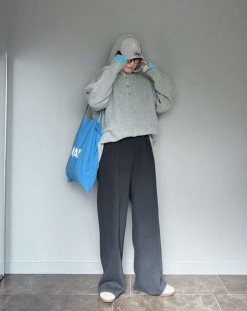 まずご紹介するのは袖口とステッチにブルーが施された配色ニット。ブルーのロゴトートバッグを合わせればおしゃれ感がさらにアップ! このときブルー以外は定番色を選んでシンプルに仕上げるのがコーデをうまくまとめるコツです。