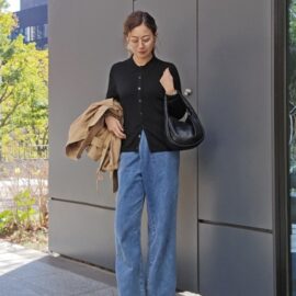 このときカーディガンのボタンを全留めするのがコツ。上半身がコンパクトにまとまり、上品な雰囲気に仕上がります。ベーシックな黒カーディガンで今どきのルックスが楽しめますよ。