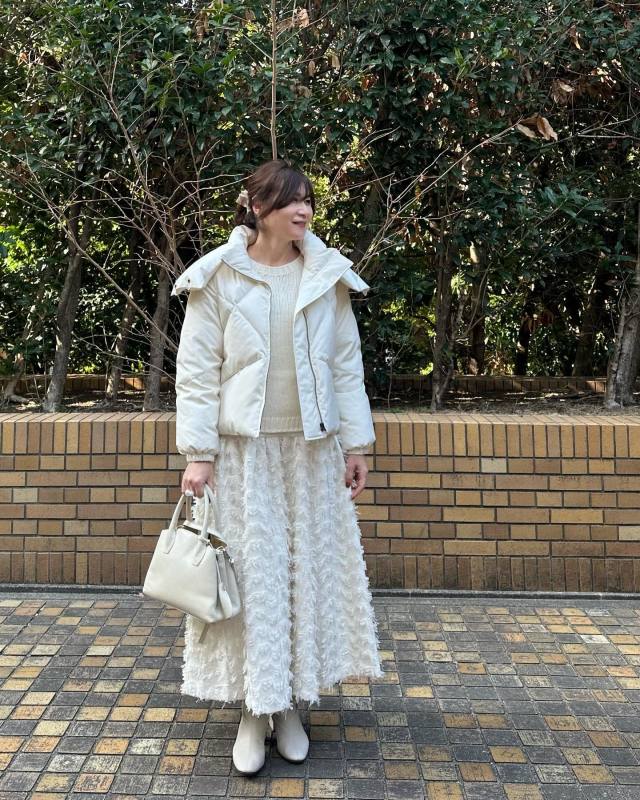 まずご紹介するのは、フェザー生地の白スカートを主役にした冬のオールホワイトコーデ。ダウンのフラットな生地とスカートの立体感からコントラストが生まれ、ワントーンでもメリハリのあるスタイリングが完成します。