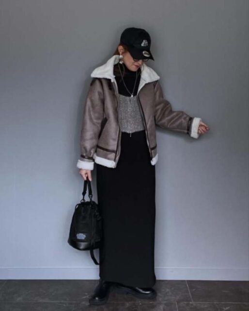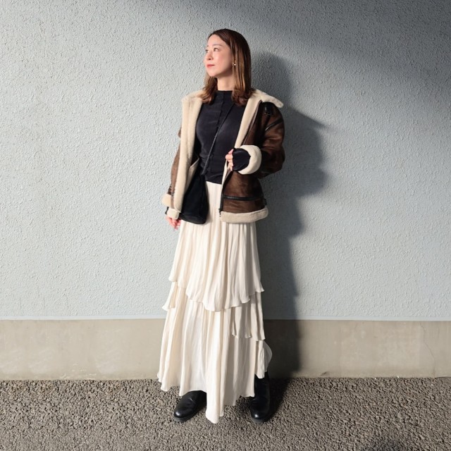 このアウターはフライトジャケット風のデザインに辛口な雰囲気があるのが持ち味。ロングスカートに羽織るとハズしになって、おしゃれに決まりますよ。