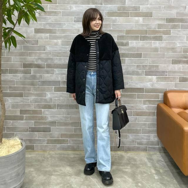 ボアブルゾンのコーデはアイテム選びが鍵。40代50代にイチ押しなのが「異素材MIXのボアブルゾン」です。例えばナイロンやキルティング生地との切り替えデザインならボアブルゾン独特の量産アイテムっぽさがなく、カジュアルな服に羽織るだけでサマになります。