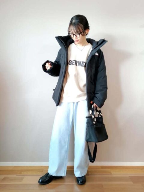 2|ロゴスウェットにダウンジャケット・ツイードコートを羽織る