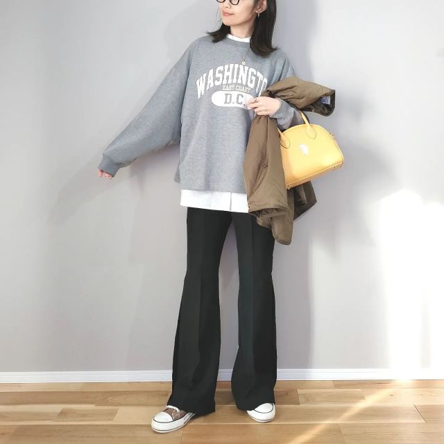 ロゴスウェットがゆったりシルエットなら、おすすめなのが「襟付きシャツ」との重ね着。下に着込むだけでクリーンな雰囲気が高まり、きれいめカジュアルな装いに。襟元と裾からシャツをチラ見せすると、春っぽい重ね着コーデが完成します。