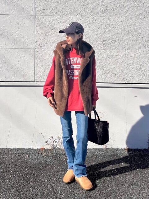 冬アウターでは暑くなってきたら「ダウンベスト・ファーベスト」がお役立ち。ロゴスウェットと相性バツグンなのでコーデが即サマに。さらにキャップやスニーカーを合わせるとスポーティ感がいっそう高まります。