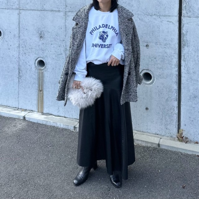 まだまだ厚手のアウターが手放せない2月上旬。ロゴスウェットにダウンジャケットやツイードコートを羽織れば、気温調節になりつつ冬っぽさも控えめに。対してスウェットにリラクシーな雰囲気があるので、重量感のある冬用アウターも軽やかに着こなせます。
