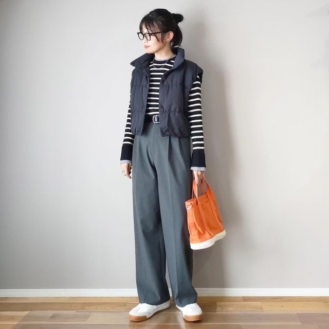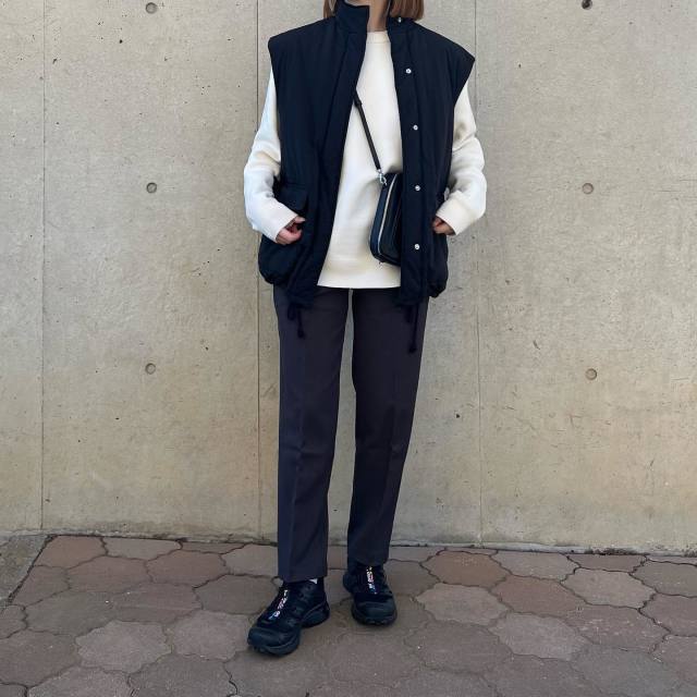 黒ダウンベスト×きれいめパンツのコーデ