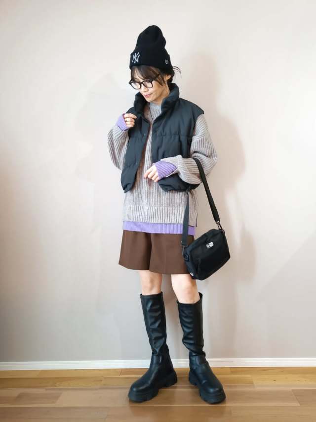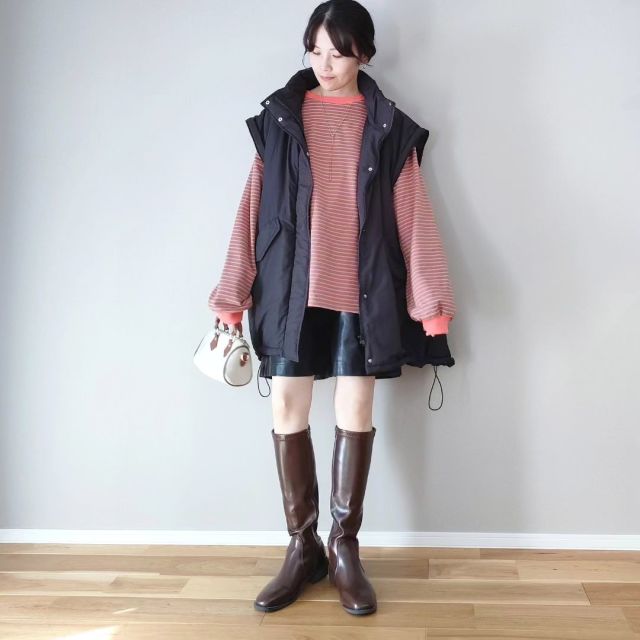 黒ダウンベスト×ブーツのコーデ
