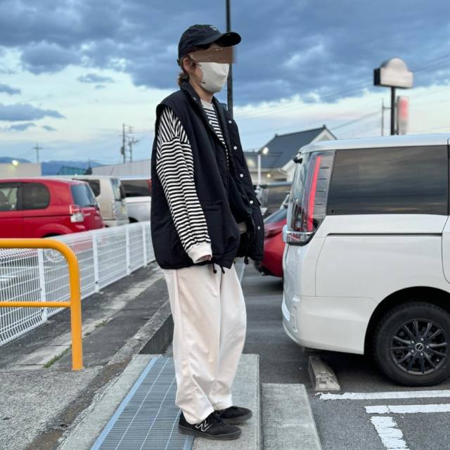 黒ダウンベスト×ボーダートップスのコーデ