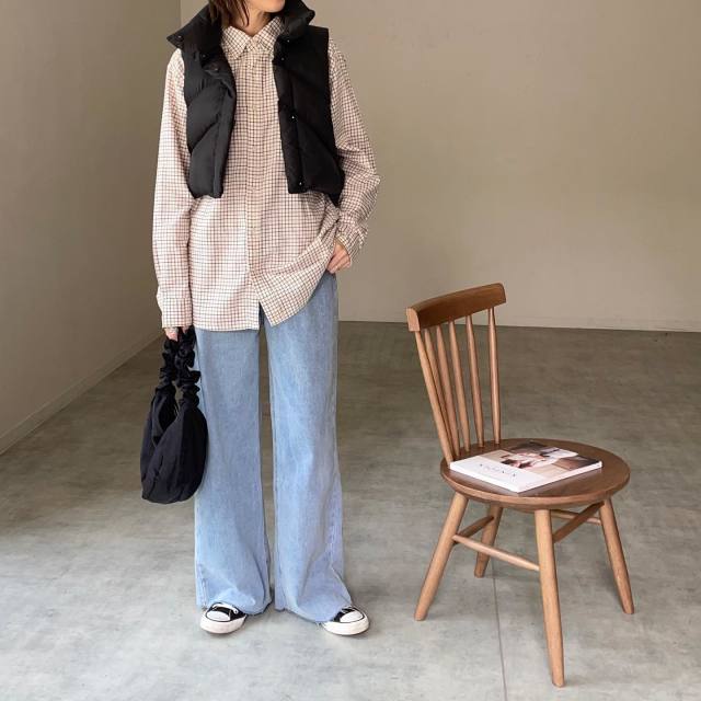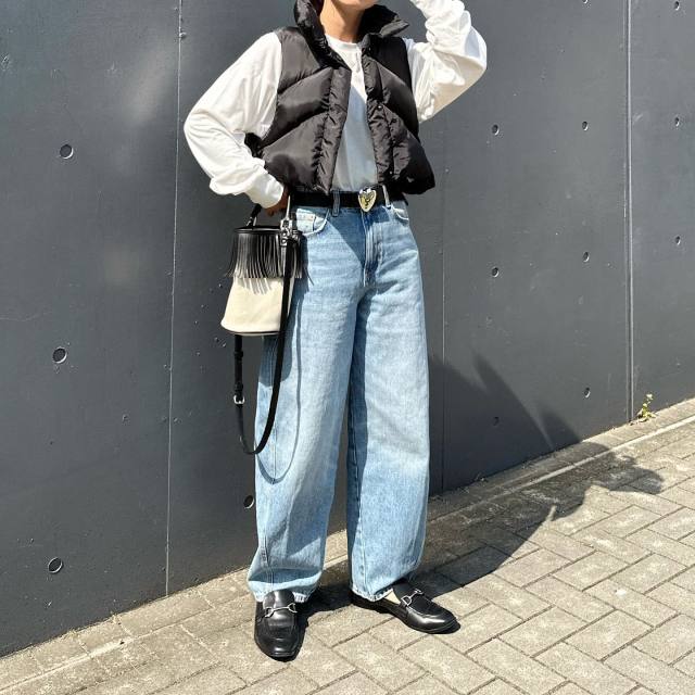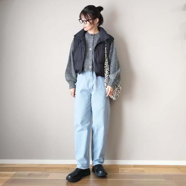 黒ダウンベスト×デニムパンツのコーデ