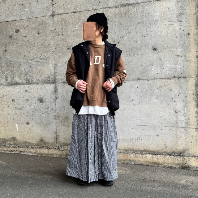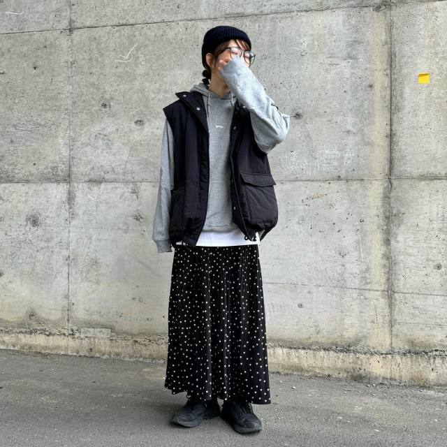 黒ダウンベスト×柄スカートのコーデ