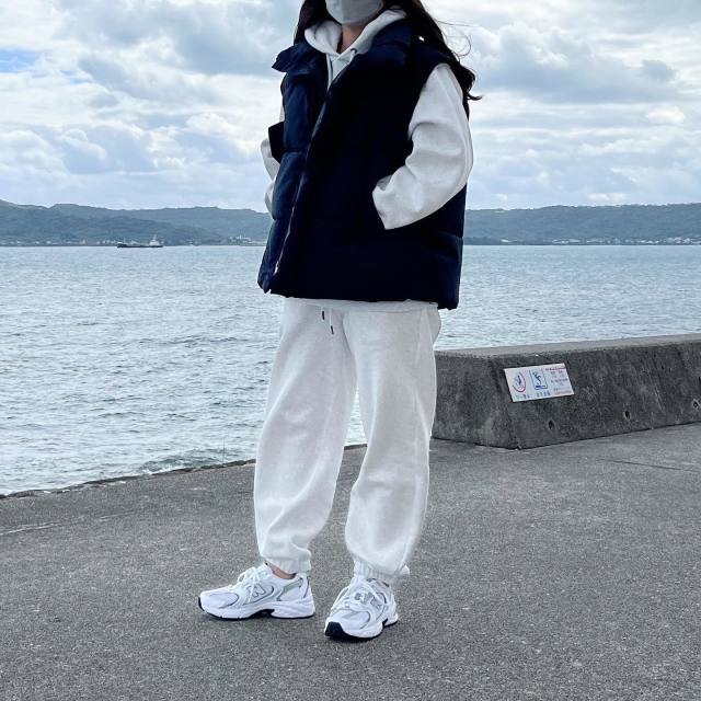 黒ダウンベスト×白トップスのコーデ