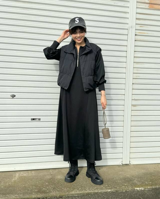 黒ダウンベスト×ワンピースのコーデ