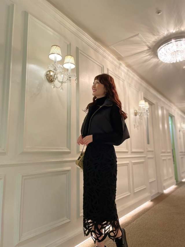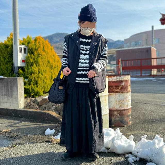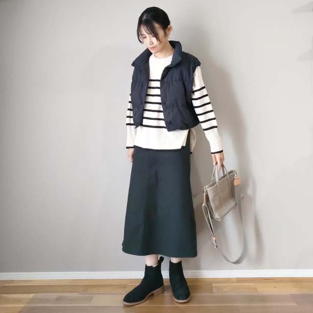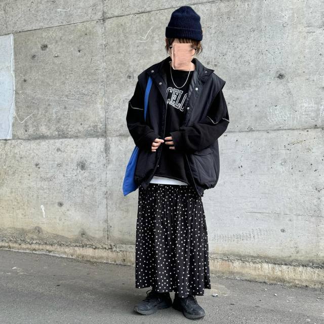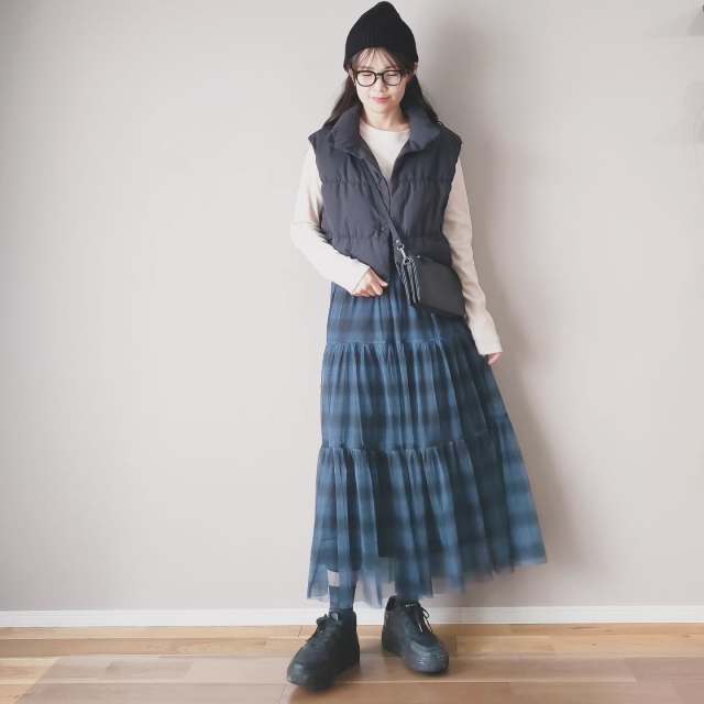 黒ダウンベスト×スカートのコーデ