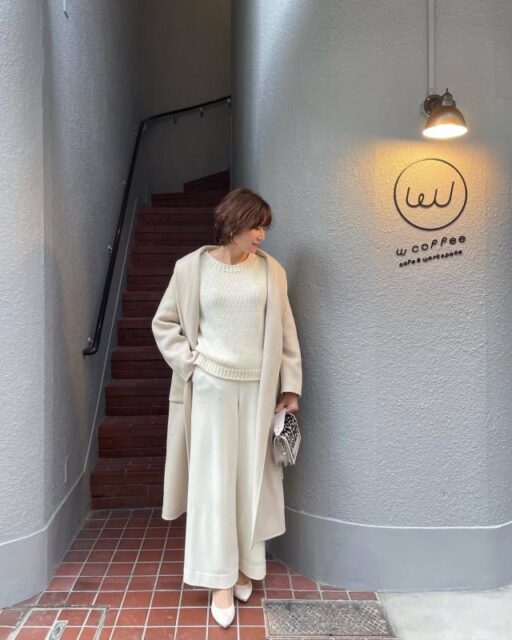 簡単なのが「秋冬素材の服×ブーツ」の組み合わせです。ニット・スウェード・コーデュロィなど秋冬向きの素材で取り入れれば、全身白でも温かみのある装いに。足元のブーツも相まってシーズンムードが高まります。