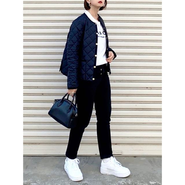 カジュアル派さんには「白インナー×デニムパンツ」との合わせがイチ押し。真っ白なTシャツやシャツにデニムパンツを合わせるだけで黒キルティングジャケットが春っぽい印象に。ラフでサマになる着こなしが完成します。