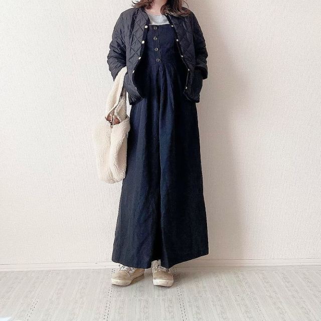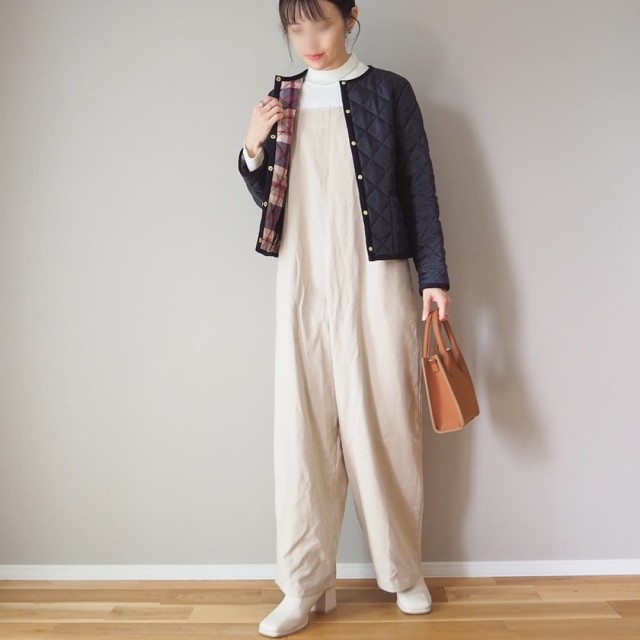 黒キルティングジャケットは「オールインワン・サロペットパンツ」と相性バツグン。ダボッとしたパンツが暗い色のキルティングジャケットにゆるっとした雰囲気を加え、リラクシーな装いに。気温に合わせたインナーを仕込めば2月3月の季節感に馴染みますよ。