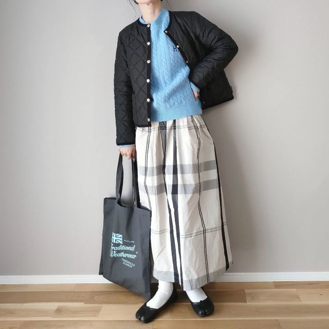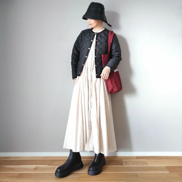 早春になったらダウンより薄手のキルティングアウターにチェンジ。ベーシックなのは黒のキルティングジャケットですが、暗い色のためコーデは沈みがちに。2月~3月にはどう着こなすのがベストなのでしょうか。
