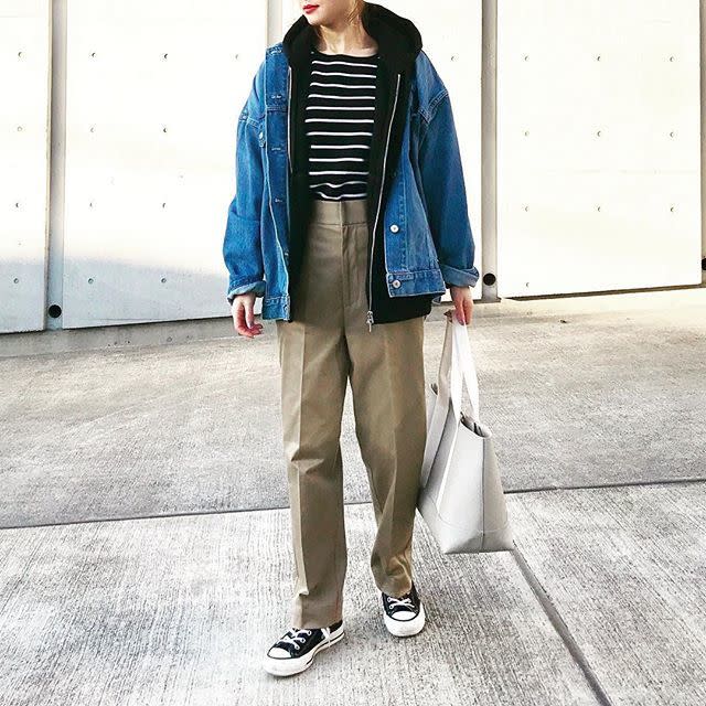 ボーダー二ットに羽織るアウターは「デニムジャケット・マウンテンパーカー」がぴったり。春アウターの代表格なので、取り入れるだけでシーズンムードがグンとアップします。その際ボーダーニットの裾をウエストインして着こなすと、スッキリまとまりますよ。