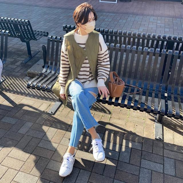 カジュアルな「ダウンベスト・キルティングベスト」はボーダーニットと相性バツグン。秋冬っぽい印象がありますが、軽やかなボーダーニットに羽織ることで一気に春らしい雰囲気に。ボトムから素足をチラリと見せ、ひと足早く季節の先取りコーデを楽しんでみては。