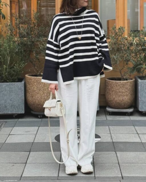 ボーダー柄のニットは保温性と爽やかさを兼ね備えた優れモノ。2月におすすめなのが「白のスカート・パンツ」との着合わせです。清潔感たっぷりな白ボトムが春らしさをプラス。シンプルでクリーンなコーデに決まります。