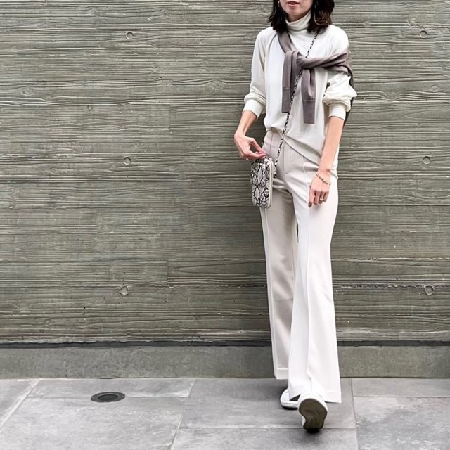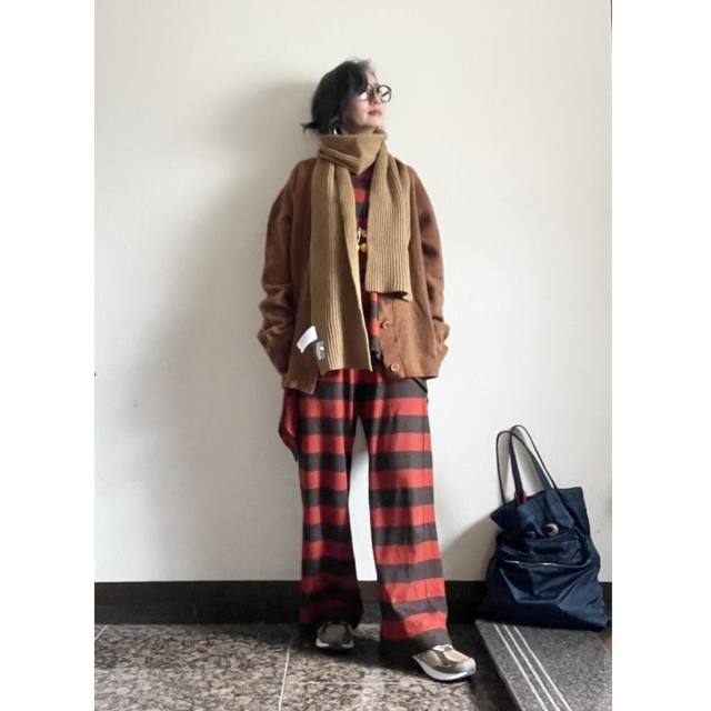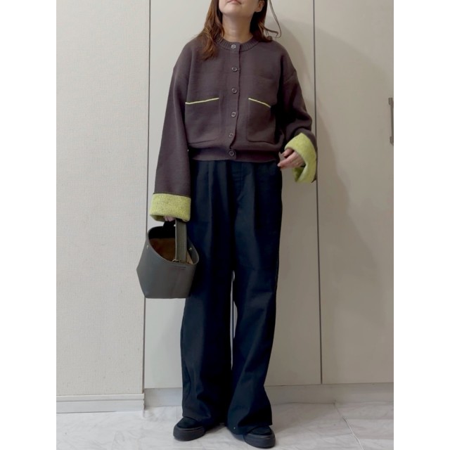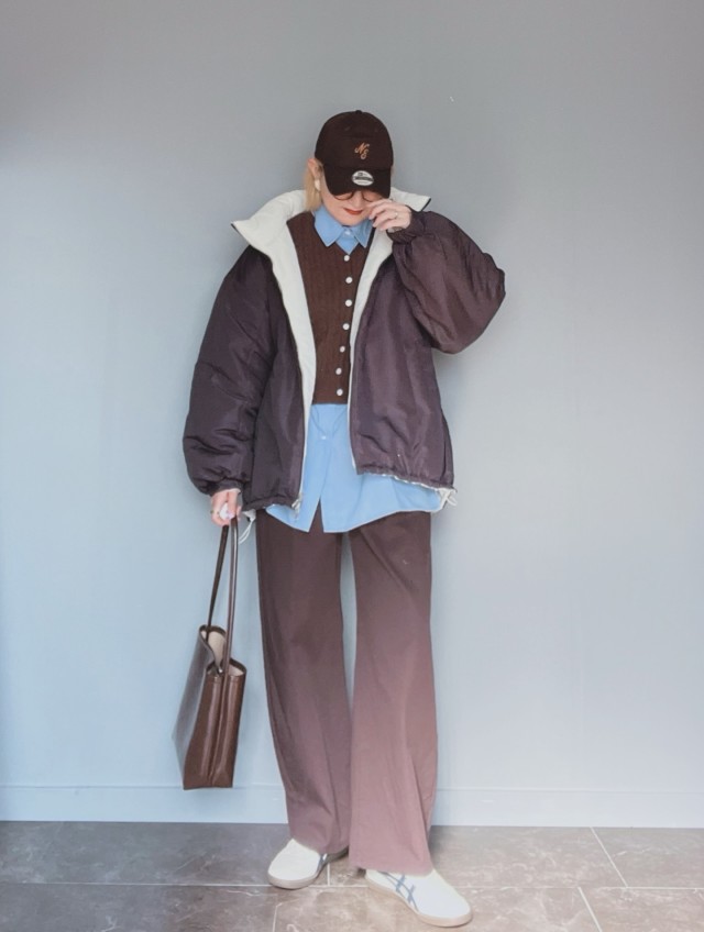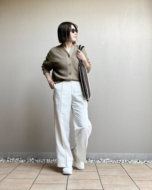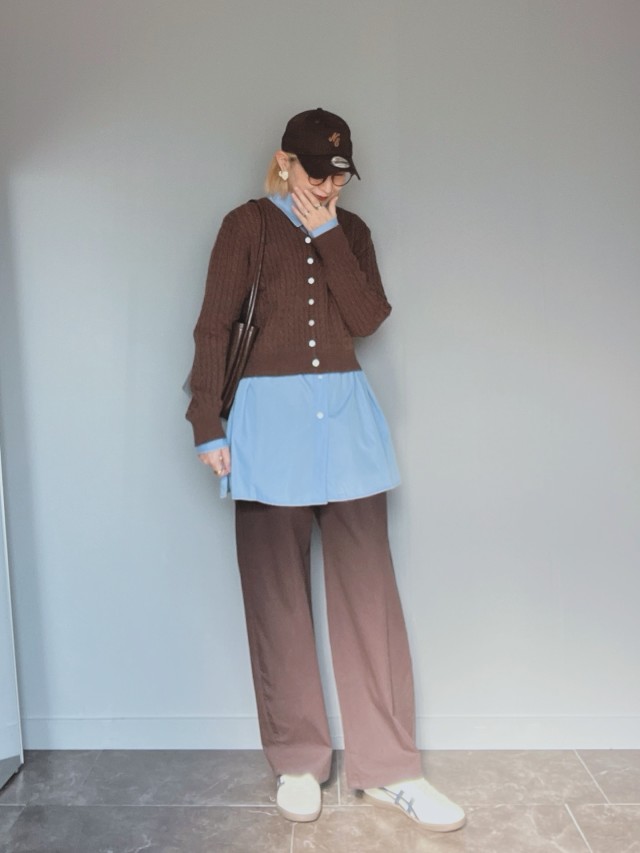 茶色カーディガン×ワイドパンツのコーデ