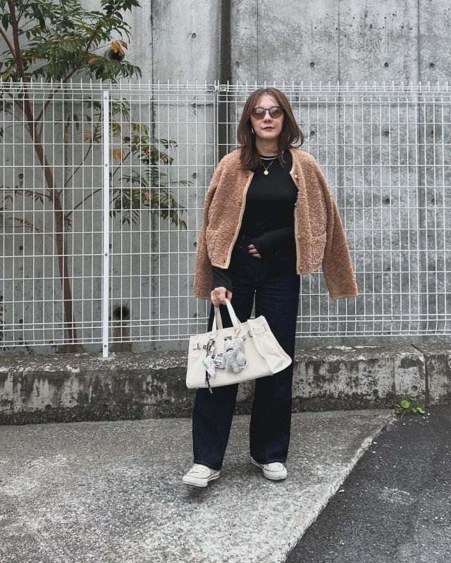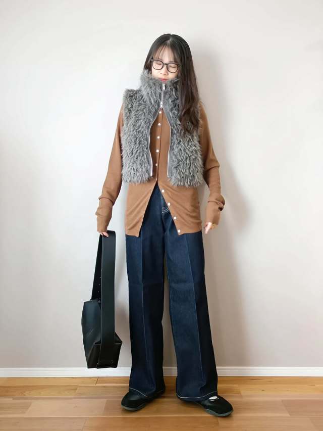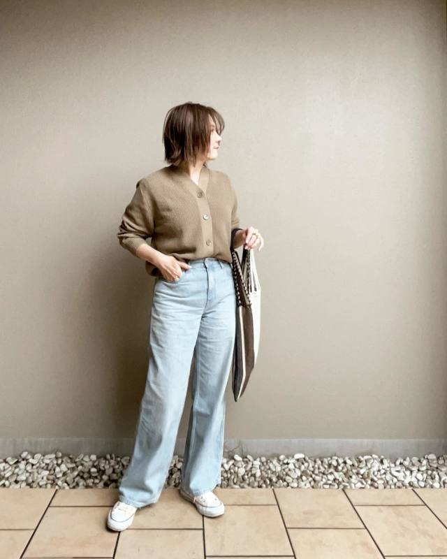茶色カーディガン×デニムパンツのコーデ