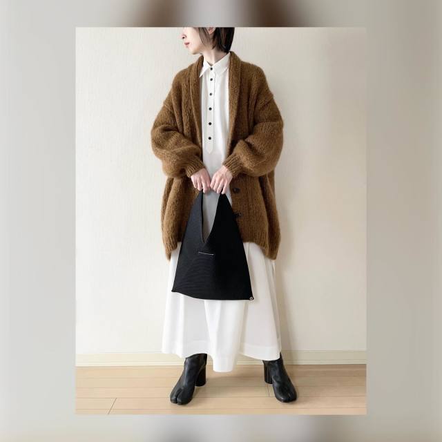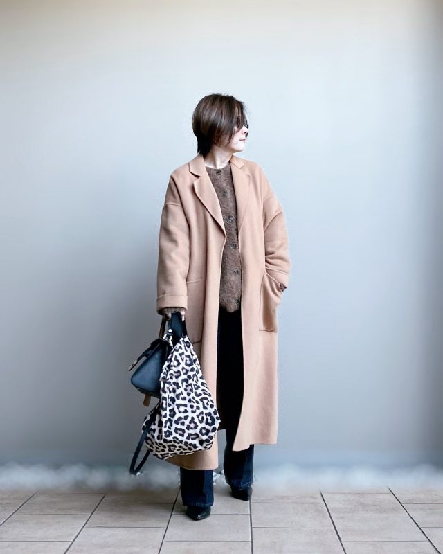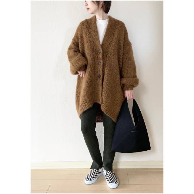長め丈茶色カーディガンのコーデ