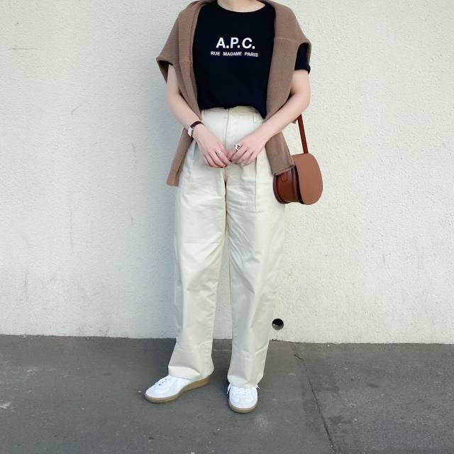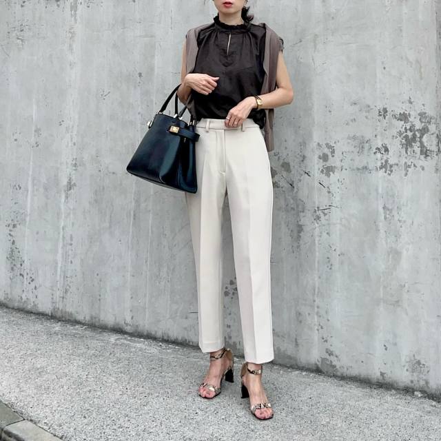 茶色カーディガン×テーパードパンツのコーデ