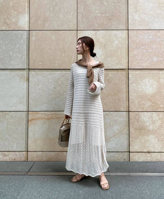 茶色カーディガン×ニットワンピースのコーデ