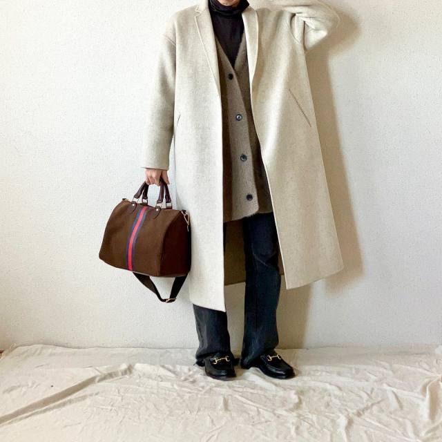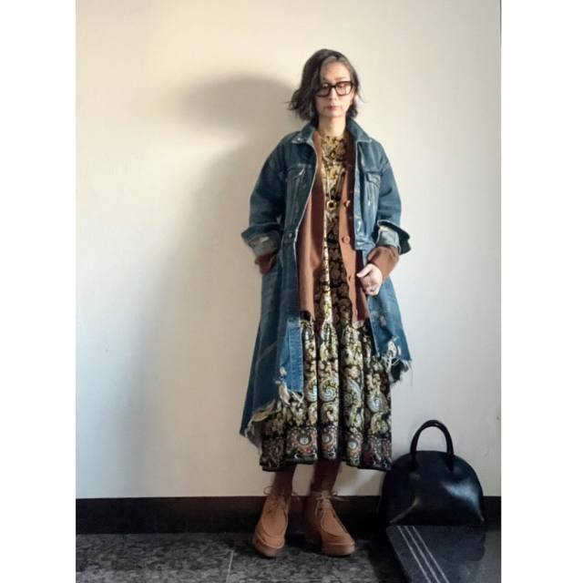 茶色カーディガン×デニムコートのコーデ