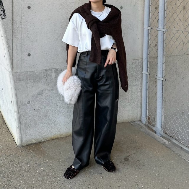 茶色カーディガン×レザーパンツのコーデ