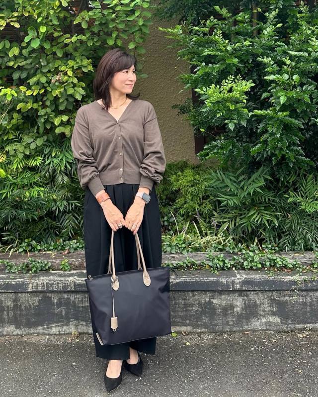茶色カーディガン×黒インナーのコーデ