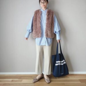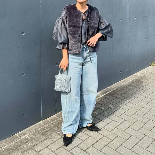 少し暖かい日には、ファーベスト×ボリュームスリーブブラウスの組み合わせもイチ押しです。ファーとブラウスの素材感の違いやシルエットで、おしゃれな奥行きを作ることができますよ。ボトムスはあえてカジュアルにまとめて、甘さとのバランスを取るとより着こなしやすくなります。