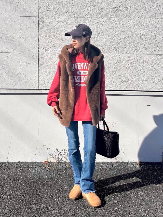 上品でラグジュアリーなイメージが強いファーベストは、あえてカジュアルなロゴスウェットをインナーにするのも可愛い! ファーベストを重ねることで、何気ないデイリーコーデが一気にクラスアップします。