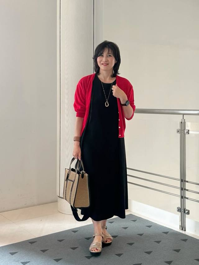 どんな色でも合わせやすい黒ワンピースは、ビビッドカラーのカーディガンを羽織って色を楽しむスタイリングもおすすめ!