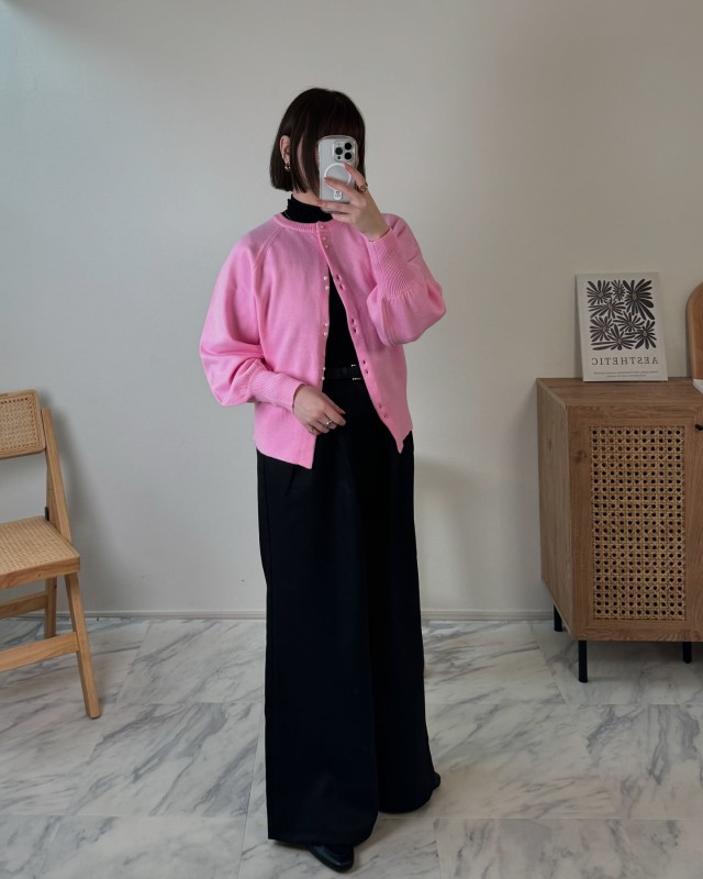万能な黒ワンピースには、こんなキャッチーなピンクカーディガンも難なく合わせることができますよ。単品だと派手に感じる色も、黒がおしゃれになじませてくれるのでコーデしやすいはず。