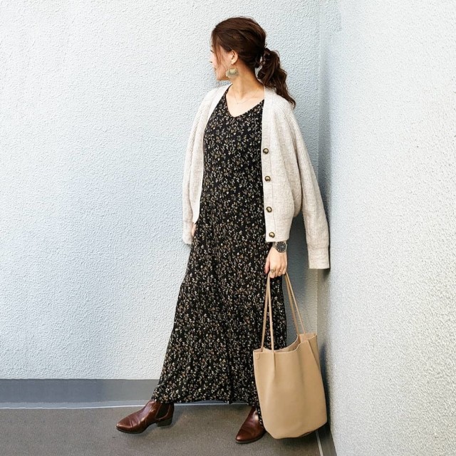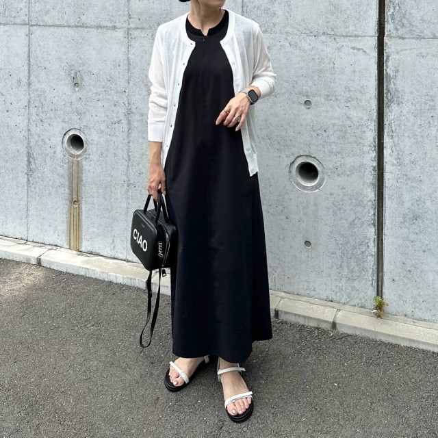 まずご紹介するのは、黒ワンピース×白カーディガンの組み合わせ。黒白のメリハリのあるモノトーン配色が、コーデをきりっとクールにまとめてくれます。カラーレスなスタイリングなので、アクセントになる小物を合わせてキャッチーに仕上げても可愛いですよ。