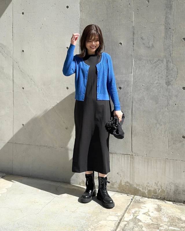 例えばスナップでは、鮮やかなブルーのカーディガンをアクセントに。青の爽やかさが、黒ワンピースコーデをおしゃれにまとめてくれます。