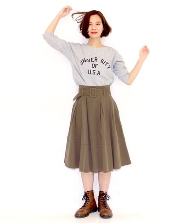 カジュアル派さんもミモレ丈スカートをおしゃれに着こなしていました。太めのベルトでウエストマークしたシルエットも、2015年らしいディテールです。