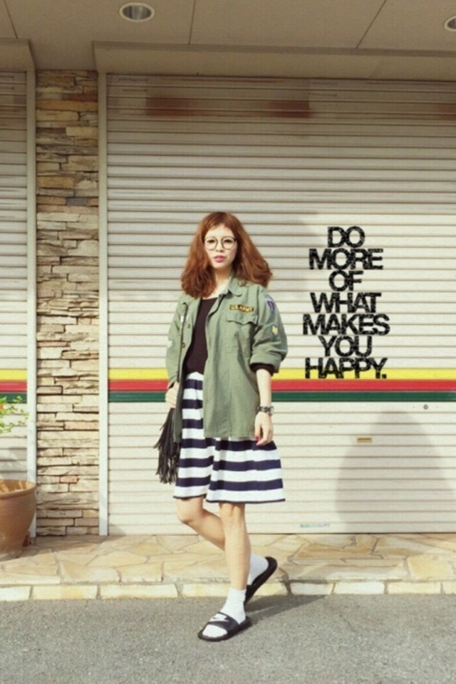 こちらは、大胆なボーダー柄ひざ丈スカートをカジュアルにスタイリング。ガーリーミックスなデイリースタイルが2015年らしいおしゃれコーデです。